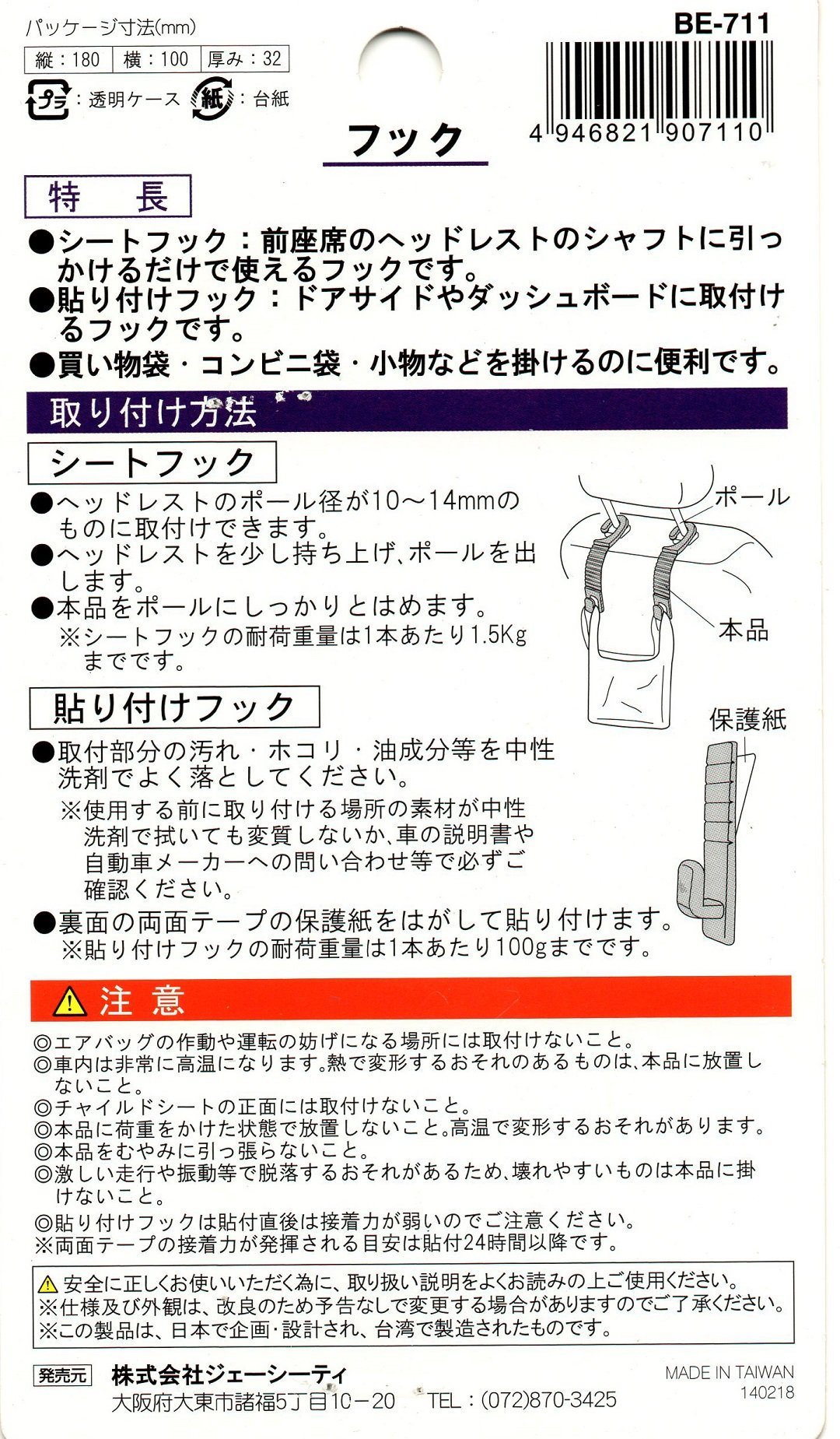 日本TAKUMI BE-711 車用座椅掛勾+黏貼掛勾組